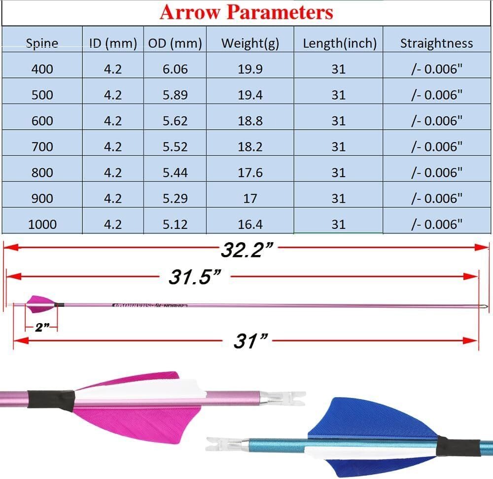 Arrow spine ensures the arrow flexes correctly when shot. Match your draw weight and arrow length to the appropriate spine: