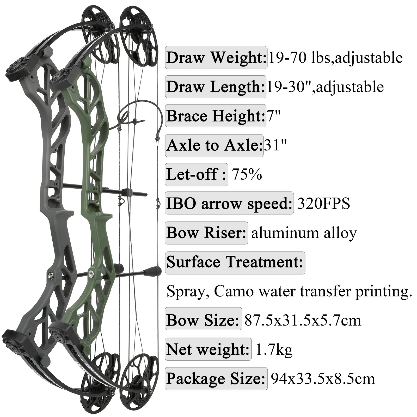 • Draw Weight: 19-70lbs (adjustable without bow press)