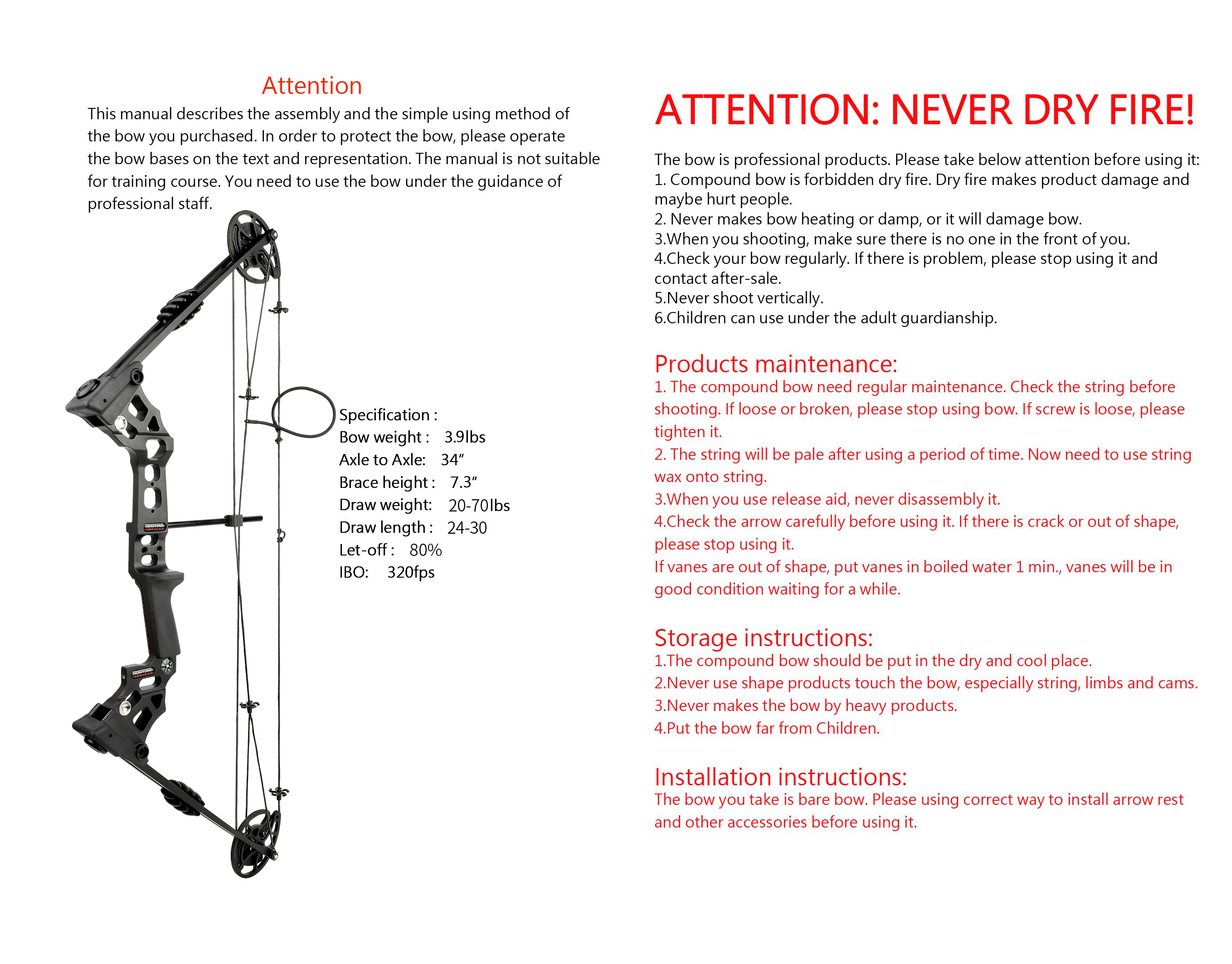 • Have Right & Left handed two types for option;The RIGHT HANDED compound bow will be held in your left hand,pull the string with your right hand,and determine the arrow with your right eye to achieve perfect aim.The LEFT HANDED compound bow will be held in your right hand,pull the bow string with your left hand.