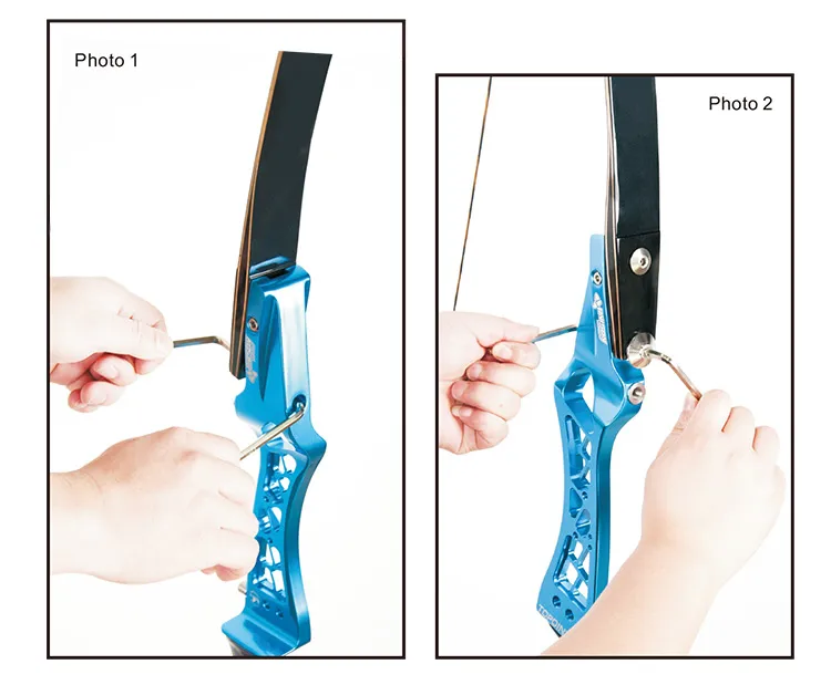 Before adjusting the alignment of the riser, first check the center string position towards the riser. You can adjust the center shot without unstringing your bow.1. Unscrew both locking screws (photo 5)2. To adjust limb position to the left, loosen the inner left side bolt (photo 6) and tightenthe right sided one till the limb is centered.3. Once the limb is centered, retighten the left side bolt (photo 6)4. Fasten both locking screws (photo 5)